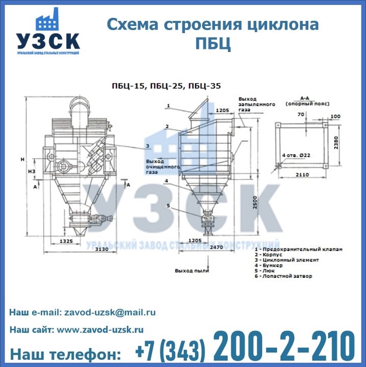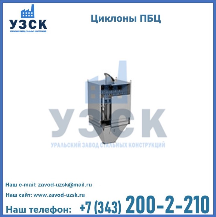 Завод «УЗСК» в Белгороде предлагает приобрести циклоны ПБЦ и прочие устройства, полностью укомплектованные и готовые к эксплуатации. Мы гарантируем соответствие оборудования всем требованиям ГОСТ и ТУ, износостойкость и высокую производительность предлагаемого оборудования. Уральский Завод Стальных Конструкций изготавливает и продает надежное, эффективное и производительное оборудование, имеющее длительную гарантию и большой эксплуатационный ресурс. Если требуется изготовить циклон нестандартных размеров, то такой вариант выполнения заказа тоже предусмотрен, так как предприятие имеет собственные производственные площади и надежных поставщиков. На все поставляемое или производимое оборудование имеются чертежи и прочая техническая документация. Заказать и купить циклоны или прочее оборудование высокого качества и по доступной цене можно через наш сайт или по указанному в разделе «Контакты» телефону.